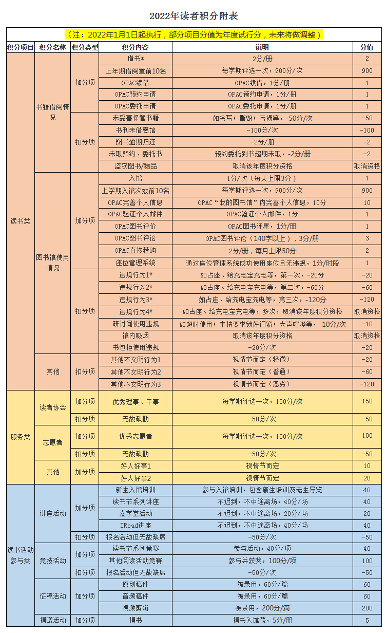 加分类:加入图书馆读者协会、图书馆志愿者团队;参与日常值班等工作,且学期考核合格;图书馆“优秀志愿者”称号。