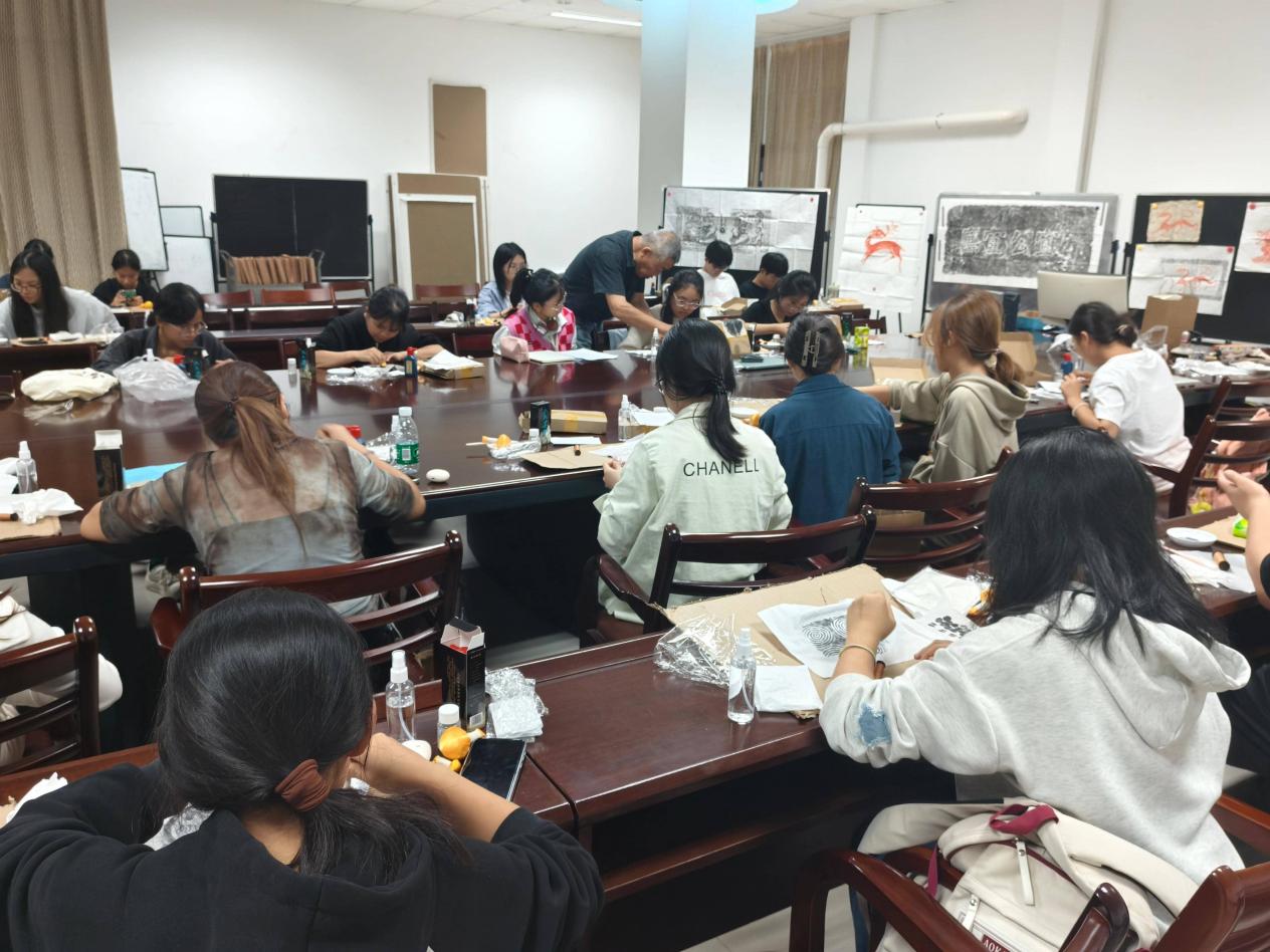 课程伊始,王占北老师结合自身研习拓片的经历,向同学们展示了多幅风格各异的拓印佳作,细腻的纹理与古朴的韵味瞬间点燃了同学们的兴趣。随后,他系统讲解了拓印的基本原理与操作流程,从印纸、塑料薄膜、纹理底板等工具的选择,到蒙纸、刷水、固定等基础技巧,再到上墨时的力度与均匀度控制,逐一细致演示,帮助零基础的同学快速掌握要领。
