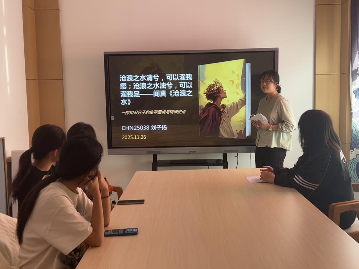 人文与传播学院的刘子扬分享了《沧浪之水》。她从屈原“沧浪之水清兮,可以濯我缨;沧浪之水浊兮,可以濯我足”的千古名句切入,探讨了主人公池大为在理想与现实之间的艰难抉择。她认为,这部作品如同一面镜子,映照出当代青年在成长过程中面临的普遍困惑与价值选择。