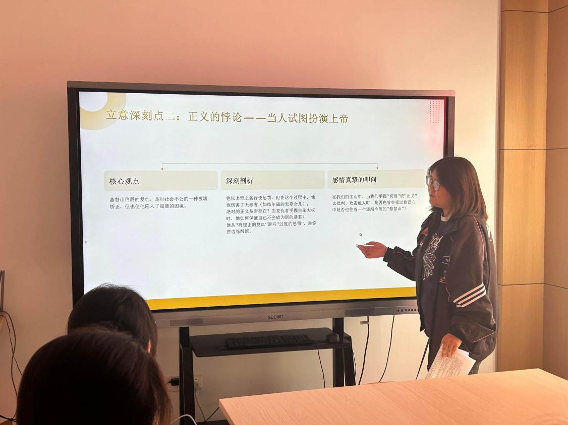 经典名著《基督山伯爵》引发了现场关于正义、复仇与宽恕的深度探讨。2025级国际商务学院的李怡同学表示,埃德蒙·唐泰斯的人生故事不仅以曲折动人的情节引人入胜,更深刻揭示出人生遭遇不公时的不同抉择方向:是在绝望的泥沼中沉沦,还是在苦难的淬炼中重塑自我,为生命点亮一束希望之光。