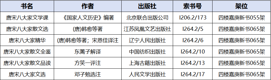 看完此篇满满干货的文化名人冷知识,你是否还想了解“唐宋八大家”背后所隐藏着的更多新颖有趣的冷知识?图书馆为大家准备了“唐宋八大家”主题的图书合集,欢迎到馆借阅哦。推荐书目馆藏信息如下: