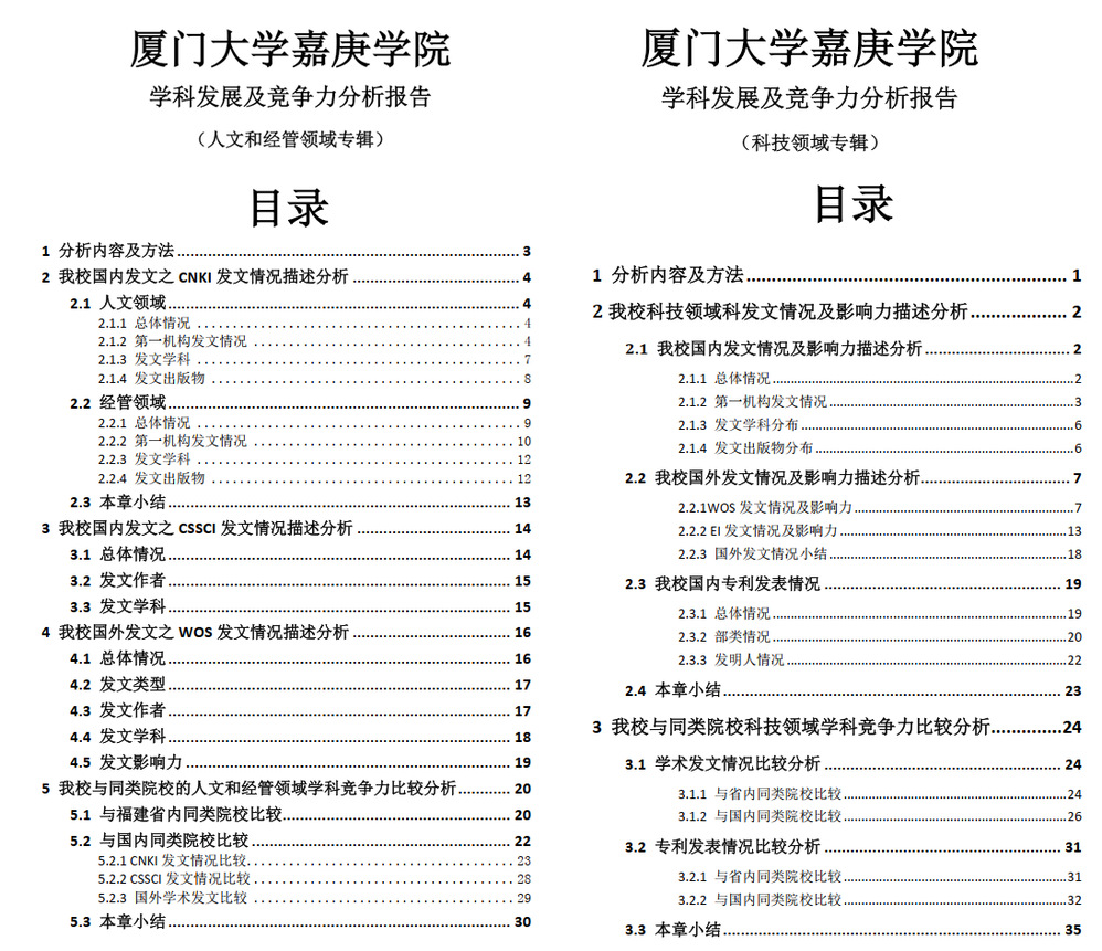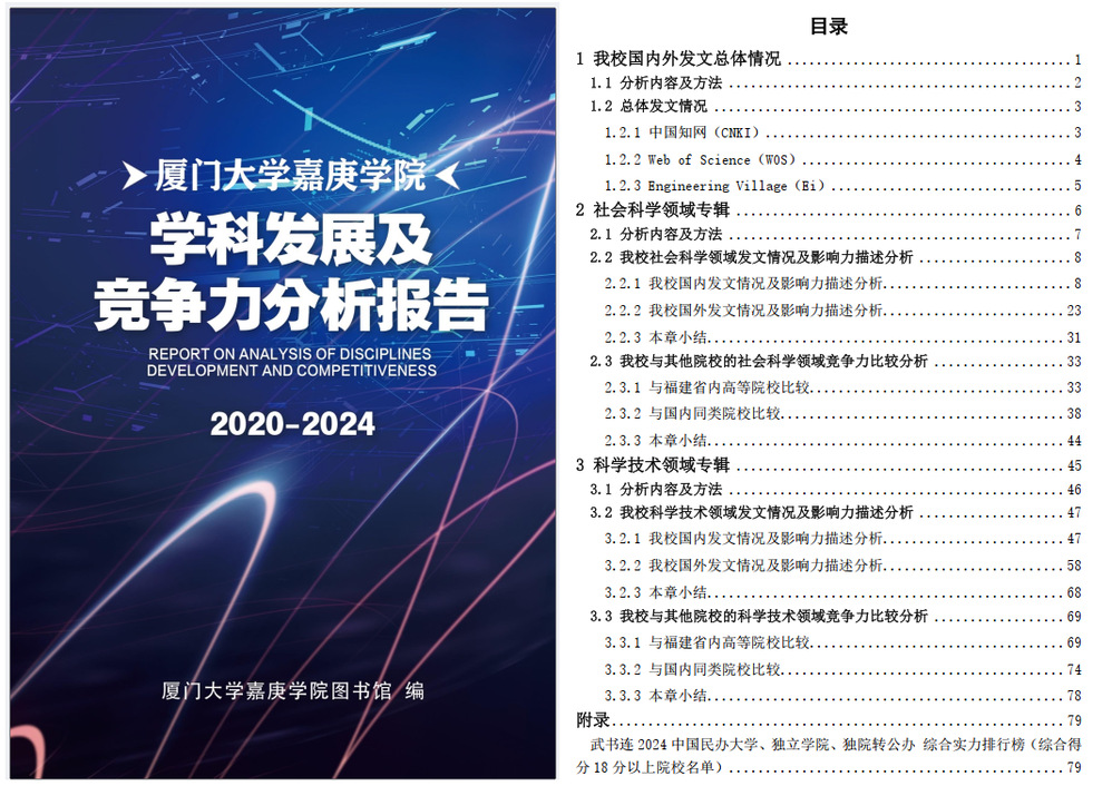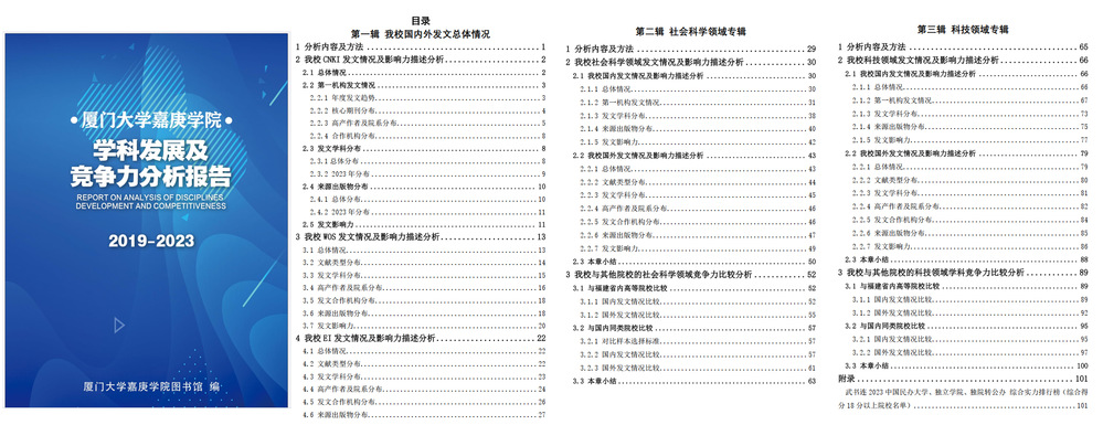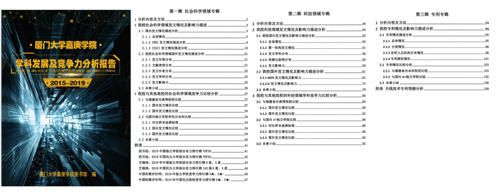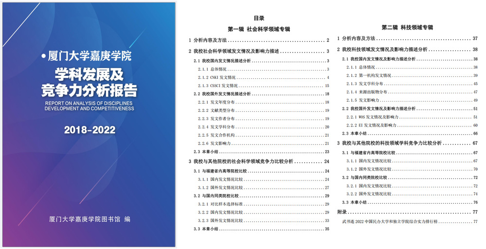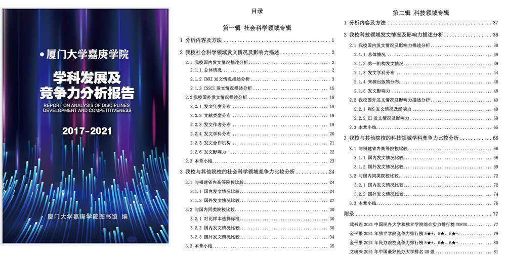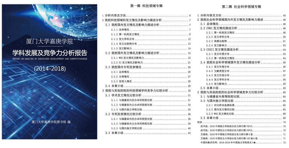 为充分了解我校的学术发展情况及我校在全国同类院校中的学科竞争力情况,我馆运用文献计量分析法、横向及纵向分析法调研制作了《厦门大学嘉庚学院学科发展及竞争力分析报告》(以下简称“报告”)。